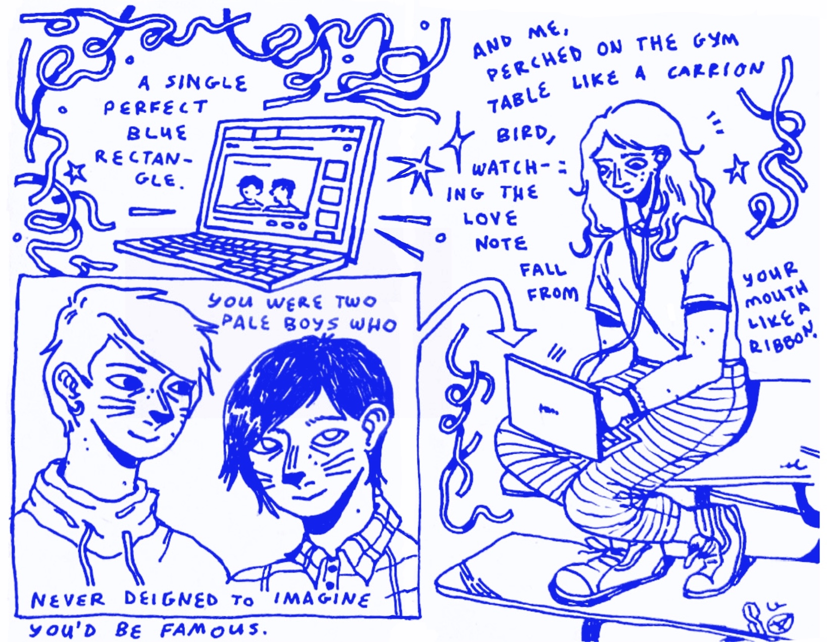 minicomic (single page zine) adapting a poem (written by me in 2025) about my teenage relationship to the then-closeted queer youtubers Dan and Phil