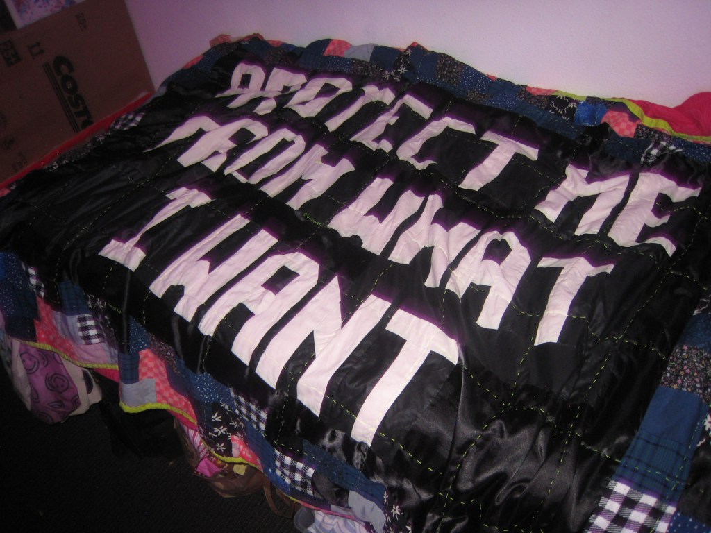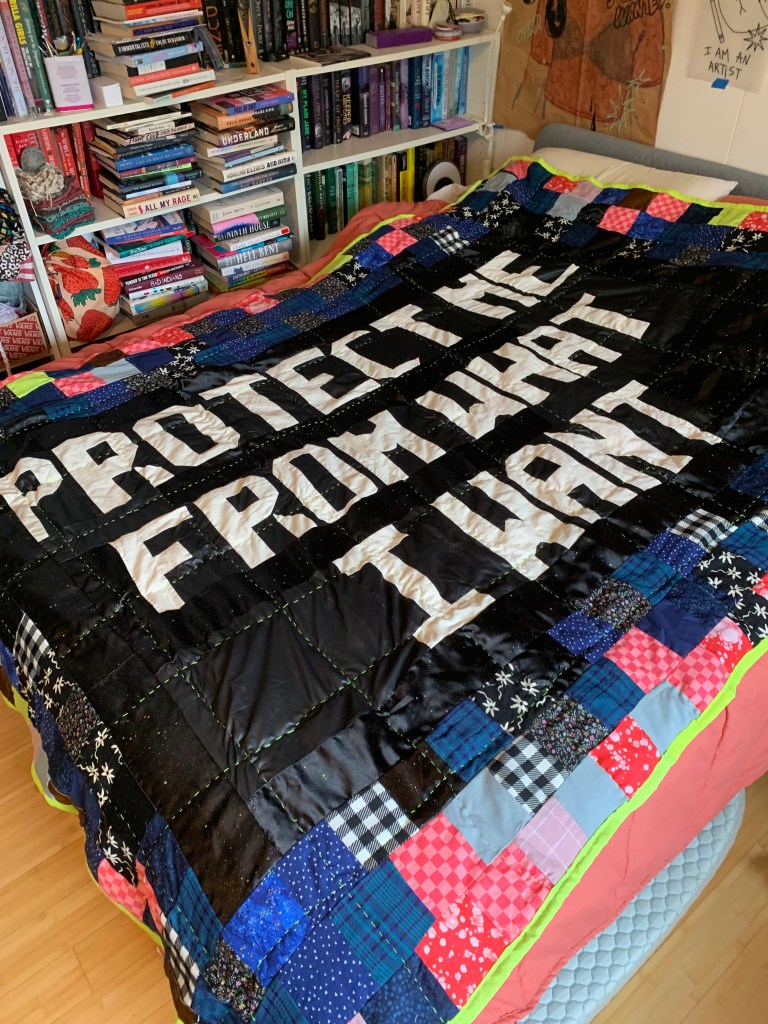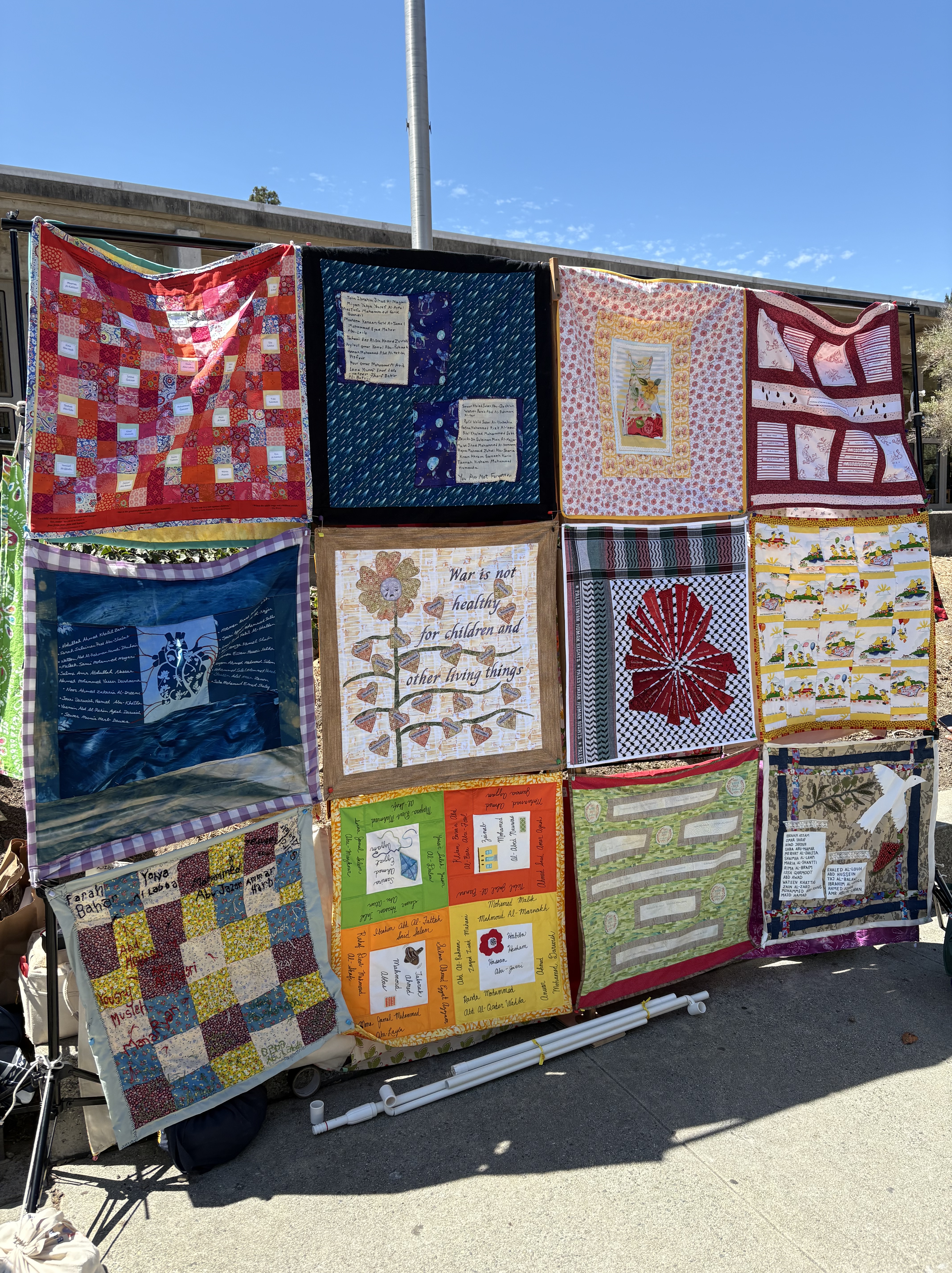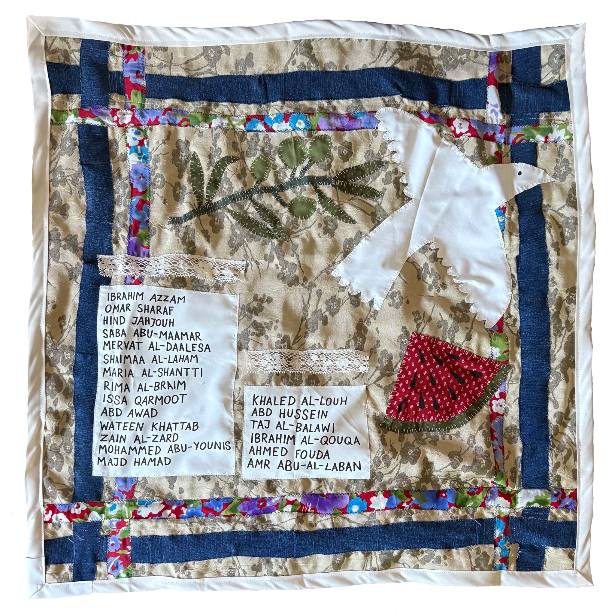 30″x30″ hand quilted baby quilt with the names of 20 infants killed in Palestine by Israeli occupying forces. 36 quilts made by other local artists were joined together to memorialize the loss of the current genocide of the Palestinian people, and to raise awareness and funds for Gazan families.